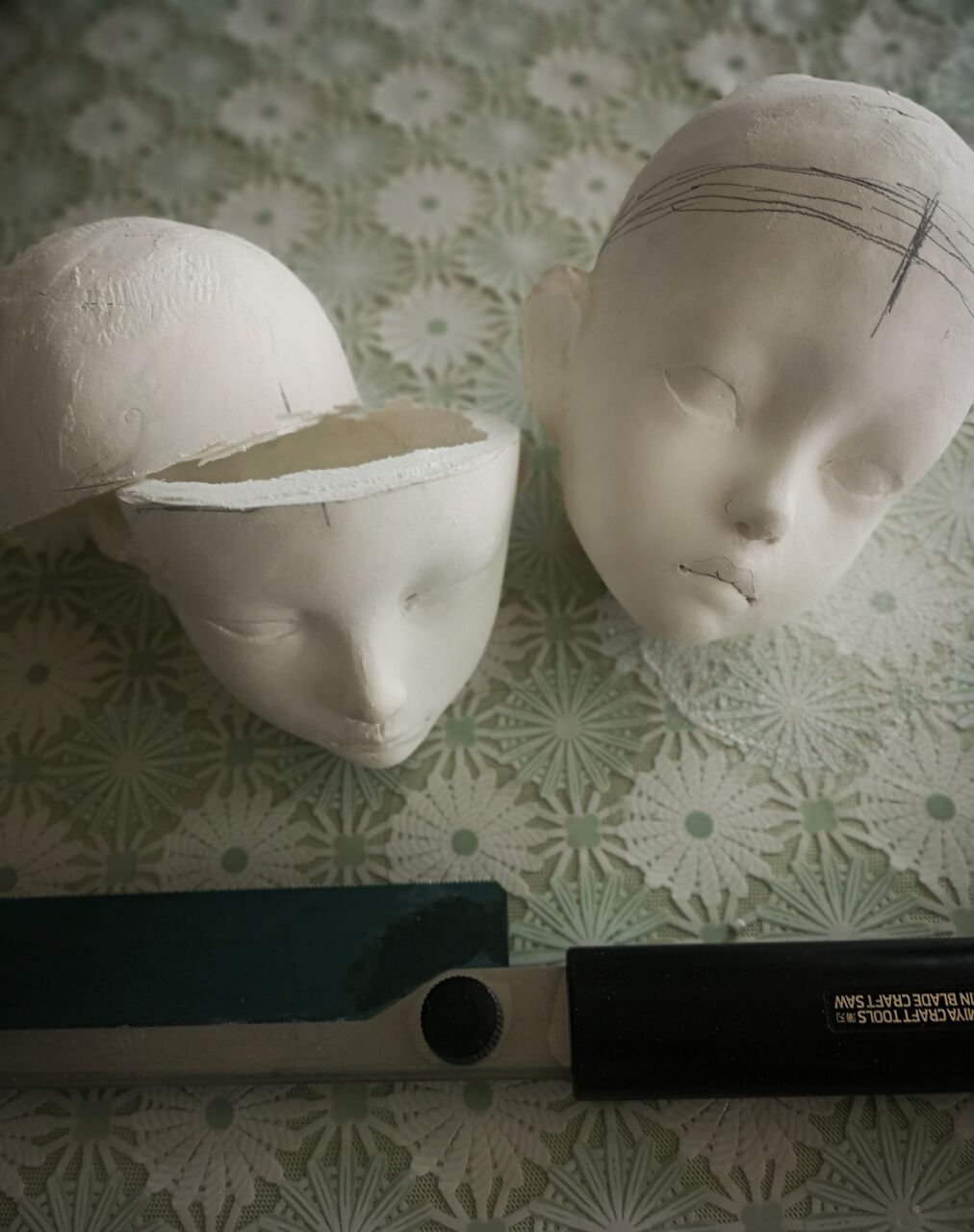 1号も2号も同時に頭部を切断してグラスアイを内側から入れる準備です。