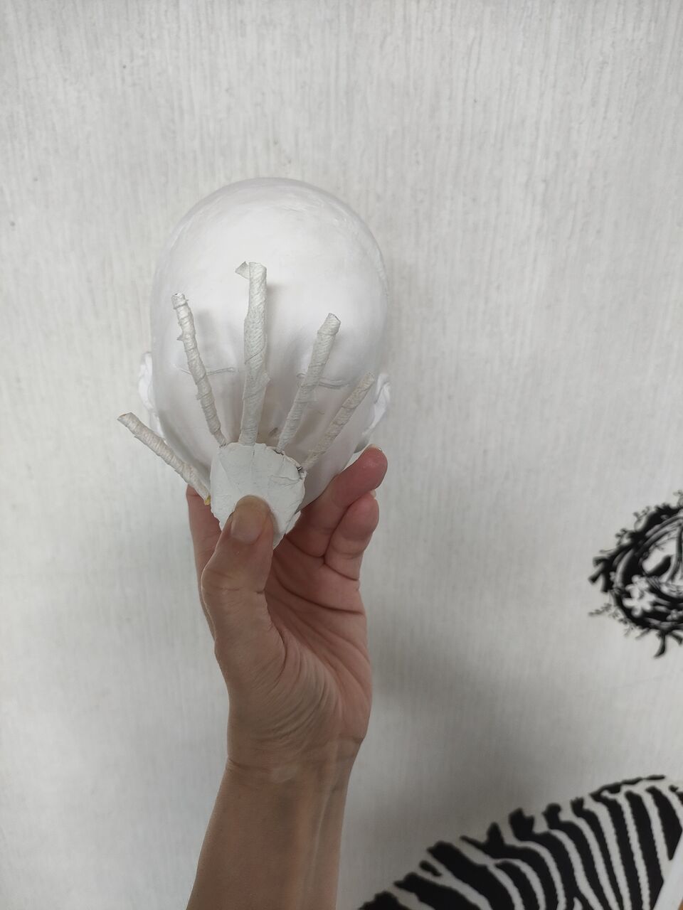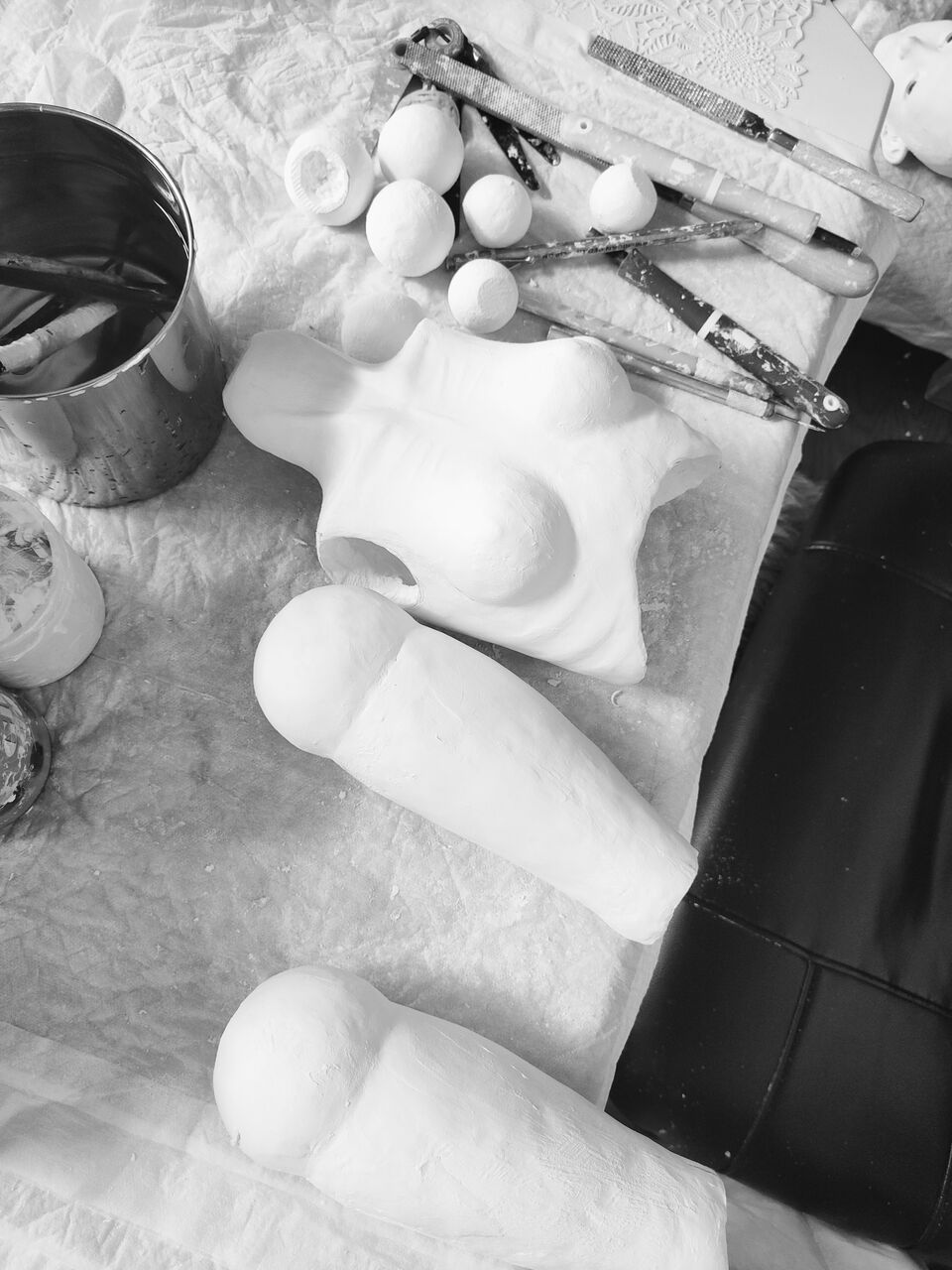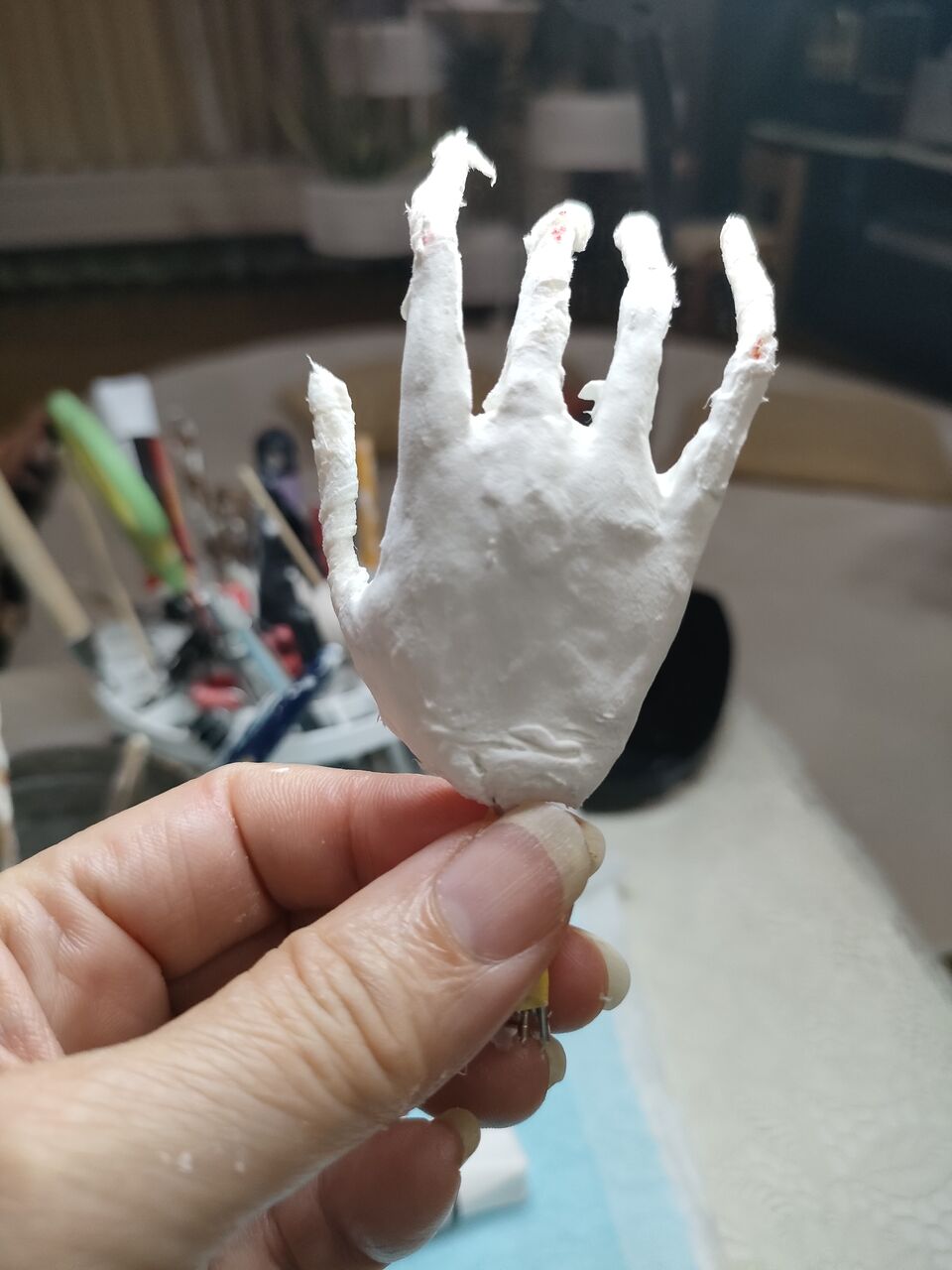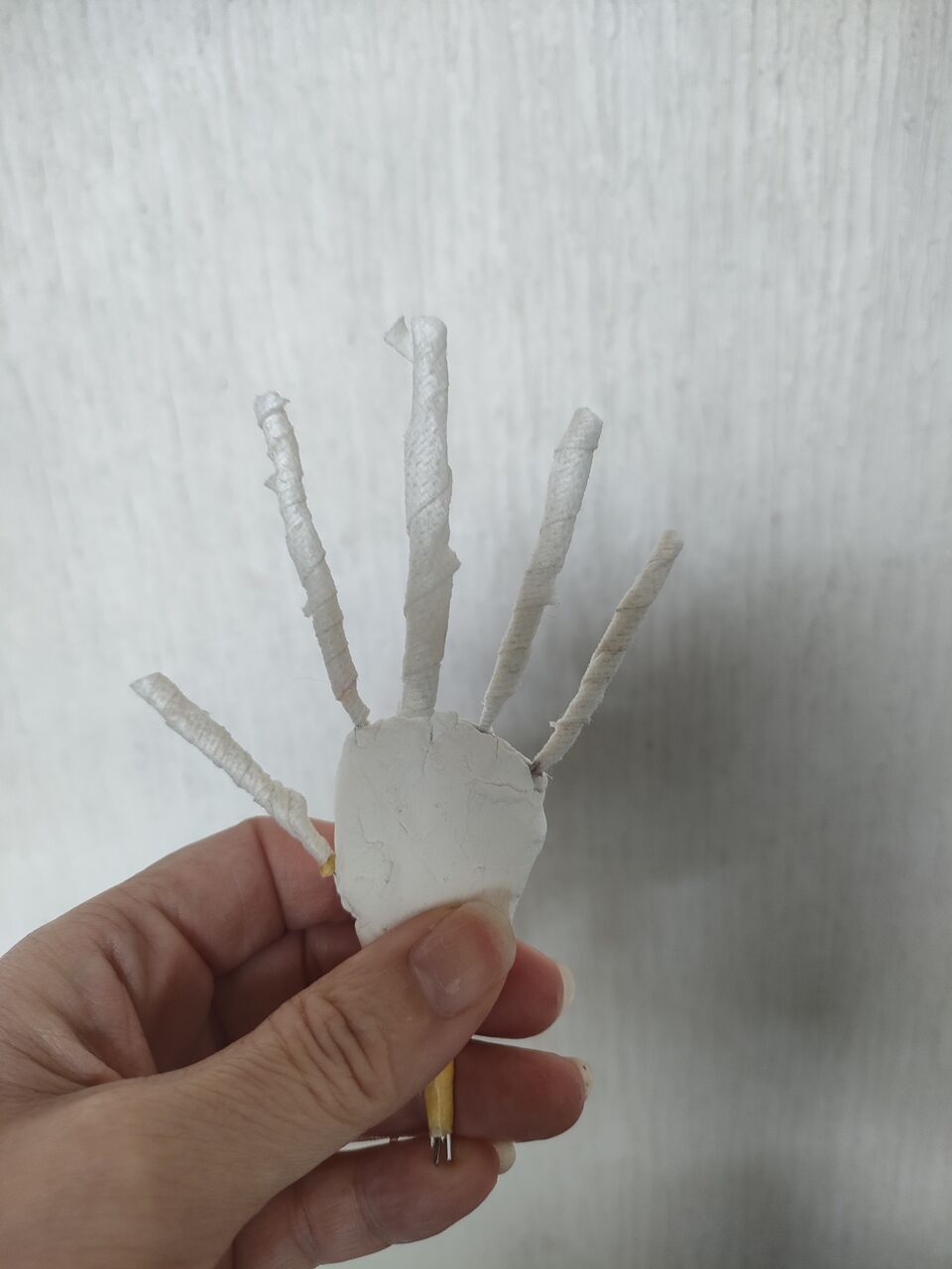 今日から芯に粘土を巻きはじめました。まずは関節にマークを入れて第二関節まで粘土を巻きます。